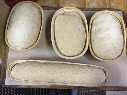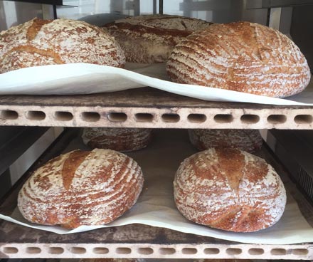 The dough is placed in a retarder, which is a refrigerator set at 39 degrees for another 14 hours. The dough will still rise and double in size and in the morning, Patrick will turn it over and bake it on hot stone in the oven at 440 degrees for 60 minutes. Patrick’s bread involves three fermentations, which take 48 hours start to finish.